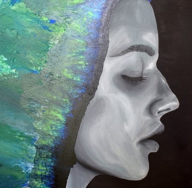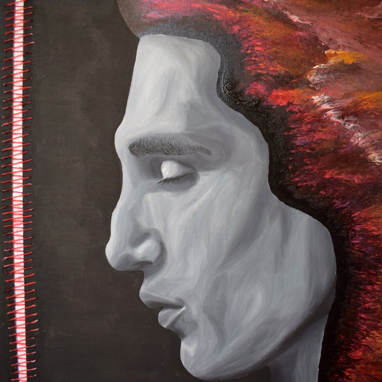 Esta obra está inspirada en el mito del hilo rojo, que dice que todos estamos conectados a alguien mediante un cordón invisible, que se puede enredar, pero nunca romper, manteniendo a ambas partes unidas contra viento y marea. En esta busco representar la confrontación de 2 energías distintas, que inundan el interior de ambos, representado mediante los colores cálidos y fríos que componen el cuerpo de los protagonistas. La energía, explosiva y brillante, se diluye cuando llega a la parte visible de nuestra persona, es decir el rostro y su expresión.