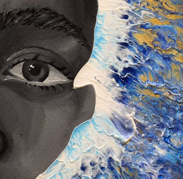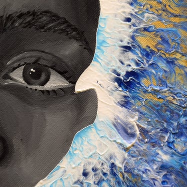 Encontramos el rostro de una mujer que apenas emerge del agua, sus ojos reflejando una mezcla de abandono y agotamiento. Los colores fríos del agua, salpicados con tonos dorados, transmiten la sensación de ser consumido por las circunstancias. Este cuadro encapsula ese sentimiento universal de estar abrumado, cuando la vida parece ser una corriente imparable que nos arrastra. La mirada de la mujer es un espejo del alma que lucha por mantenerse a flote, mostrando cómo a veces, a pesar de nuestros esfuerzos, sentimos que nos hundimos bajo el peso de nuestras cargas.