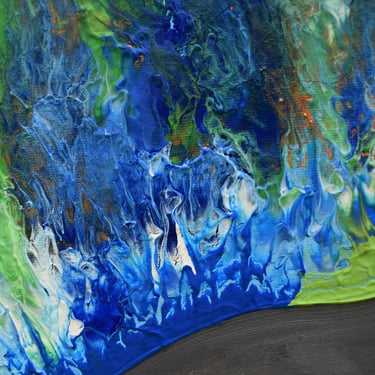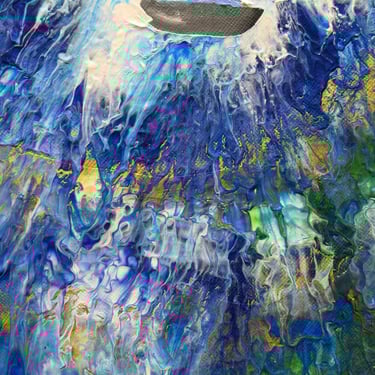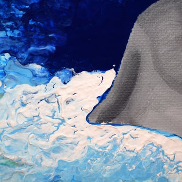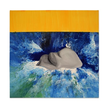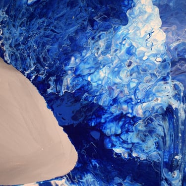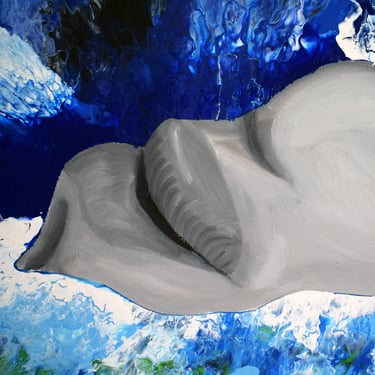 Esta obra representa el agobio vital que sufrimos a veces. Una boca emerge del agua, abierta en un grito silencioso, buscando aire. La figura está rodeada por una mezcla turbulenta de colores azules y grises que simbolizan el peso del agobio y la desesperación. Los tonos oscuros del agua contrastan con la intensidad de la boca, sugiriendo una lucha desesperada por escapar de la presión sofocante.