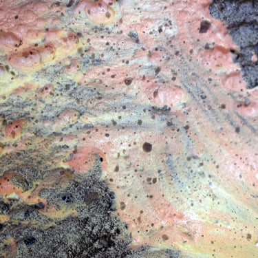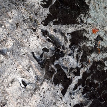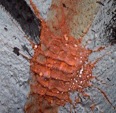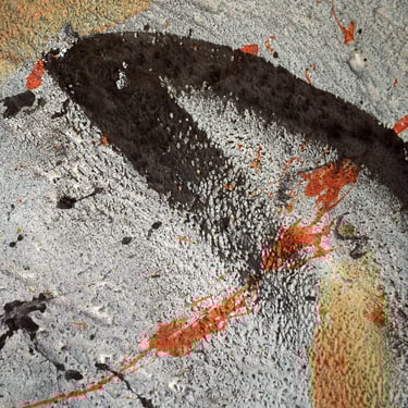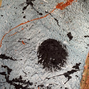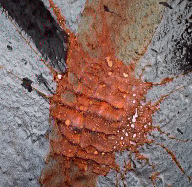 Se centra en una gran mancha negra superpuesta por una blanca. Esta superposición simboliza un período de caída o tiempo oscuro seguido por un tiempo de luz y renovación. Es una metáfora de los desafíos personales y las transformaciones que experimenté durante mi estancia en Valencia, reflejando la capacidad de la ciudad para inspirar tanto introspección como aprendizaje.