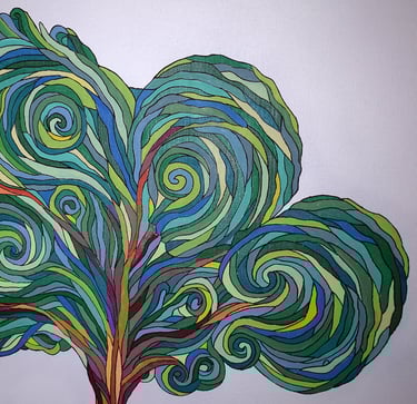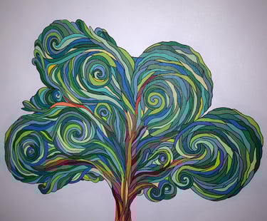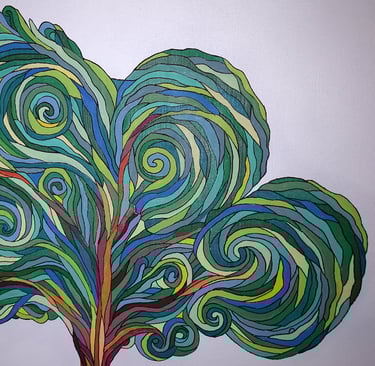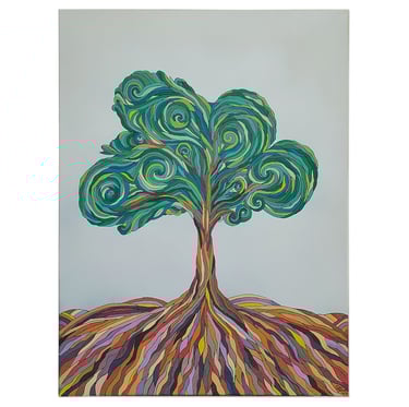 El estilo que se ha seguido para las hojas del árbol se asemejan cierta manera al aire al viento con remolinos que quieren representar los diferentes caminos que puede llevar la vida. En la parte superior derecha del árbol se encuentra el logo de la clínica psicológica de Piedad Canelles como pequeño guiño a este espacio donde se sitúa el cuadro.