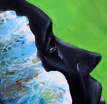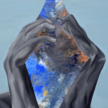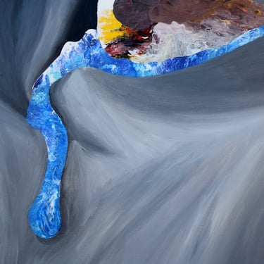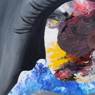 En esta obra el primer plano de un ojo es el protagonista, del cual brota una lágrima impregnada de colores fríos, en contraposición del ojo, que esta delineado en tonos cálidos, simbolizando el fuego interno que genera las emociones que emergen a la superficie. Estas lágrimas, transformadas en un torrente de matices, representan la liberación emocional y la catarsis esencial para el alivio y desarrollo personal. Los colores que fluyen de las lágrimas sugieren que, del dolor, puede nacer una belleza sublime. La pieza nos invita a contemplar la paradoja de que, a través del sufrimiento, podemos alcanzar momentos de revelación y crecimiento espiritual, recordándonos que la verdadera plenitud a menudo surge de nuestras experiencias más dolorosas.