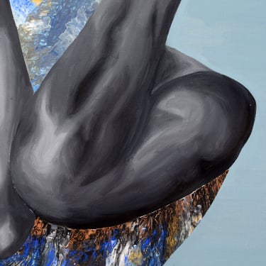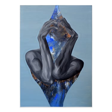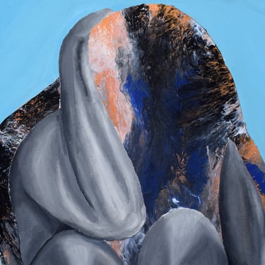 En este cuadro una mujer se encuentra acurrucada en una esquina, en posición fetal, encapsulando la sensación de aislamiento que acompaña a nuestros momentos de vulnerabilidad. Esta obra visualiza cómo los pensamientos más oscuros pueden invadir nuestra realidad, arrinconándonos en un espacio de introspección y ansiedad. La figura en posición fetal simboliza una respuesta instintiva al dolor emocional, un intento de protegerse frente a una marea de pensamientos intrusivos que inundan nuestra mente en tiempos de debilidad.