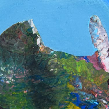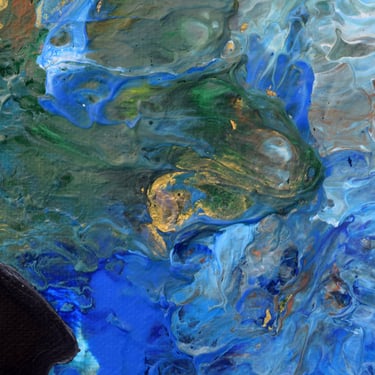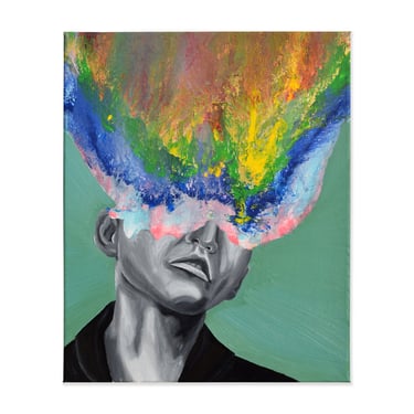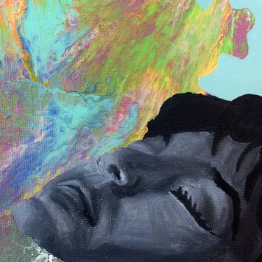 La obra sugiere que, detrás de una aparente calma exterior, existe un vasto universo de ideas, emociones y reflexiones. Los colores vibrantes y fluidos que emanan de su cabeza indican cómo los pensamientos y sueños pueden ser tanto caóticos como hermosos, reflejando el dinamismo de la mente humana.