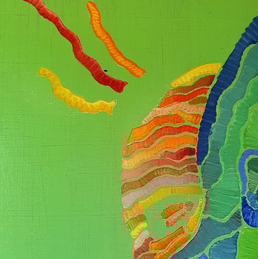 La tabla que se usa como soporte de esta obra es en origen la protección de la puerta de casa de mis abuelos, para las fiestas del barrio, como detalle se puede observar los dos huecos en el medio del lateral izquierdo para introducir las llaves en la cerradura. A día de hoy esta madera ha quedado obsoleta y se había desechado en la basura, al verla me pareció poético el simbolismo de una madera rudimentaria que había cumplido una función durante mucho tiempo mostrando así lo efímero que son las soluciones con el paso del tiempo y como el avance de los medios, hace que lo antiguo pierda validez. En cierta manera podía ver en su superficie a un anciano carcomido que pedía un último baile.