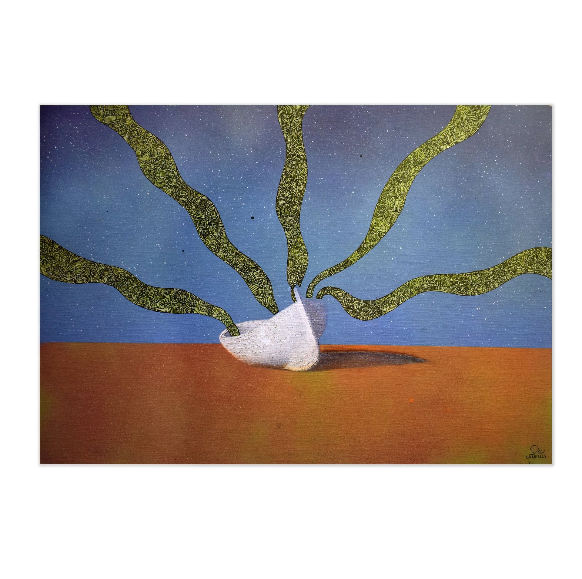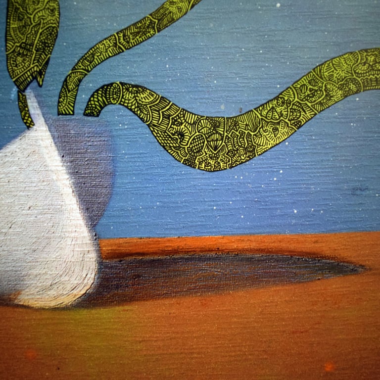 Para mi esta obra tiene la intención de mostrar cómo quedarse varado en una situación que desconoces o que no es adecuada para ti en este momento puede suponer algo bueno y una oportunidad para desarrollarse y demostrar quien eres realmente. Cultivando el autoconocimiento como pilar fundamental de tu persona. Esto se representa mediante una barca en mitad del desierto, lugar donde no debería estar porque carece de utilidad, pero en cambio, de su interior emergen varios rayos de luz y esperanza repletos de elementos creativos y de espontaneidad, como si en el interior de la Barca hubiese una puerta a otra dimensión a través de la cual emergen estos rayos.