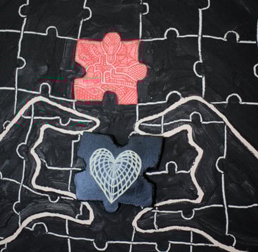 Las piezas de puzle que componen las figuras representan distintos elementos de nuestro autoconocimiento y personalidad, marcadas por cicatrices y desgastes que simbolizan experiencias pasadas. La variedad de formas busca reflejar la diversidad de rasgos humanos.